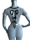 - Top con Amarre: El top de manga corta destaca por un diseño de lazo en la espalda que se ajusta a la figura, creando un detalle cut-out sensual y deportivo.